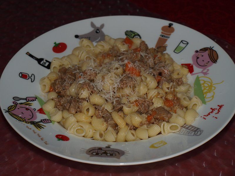 Makarončki z mesno omako, posuto s parmezanom