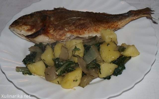 Pečena orada, krompir v kosih z dušeno blitvo in česnom