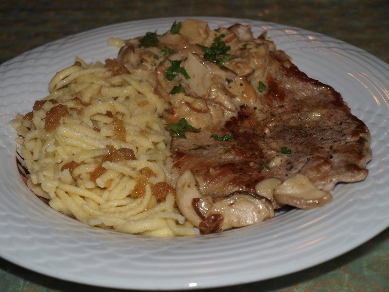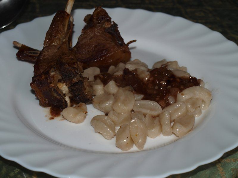 Puranja pečenka, matevž, grah s korenčkom v omaki