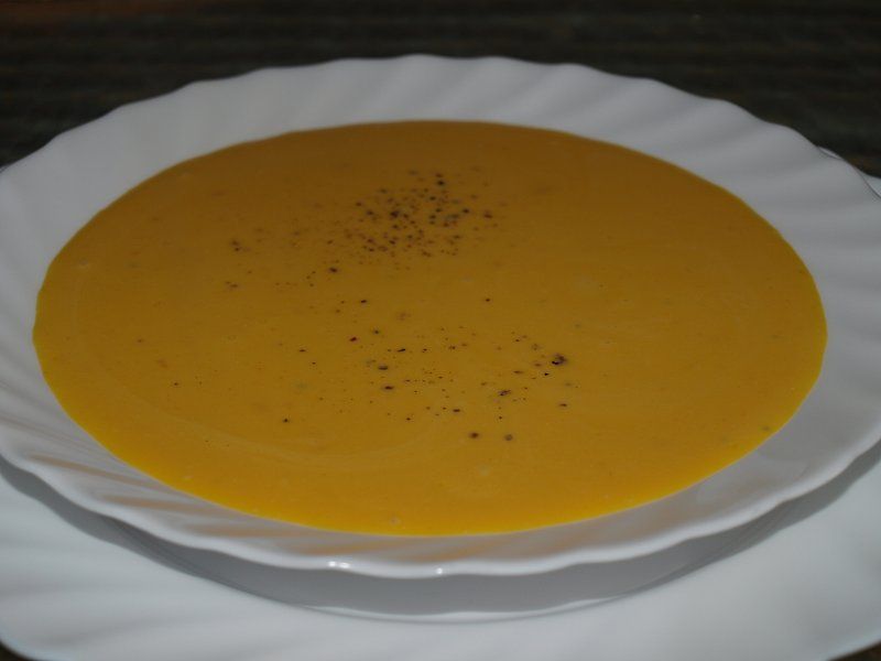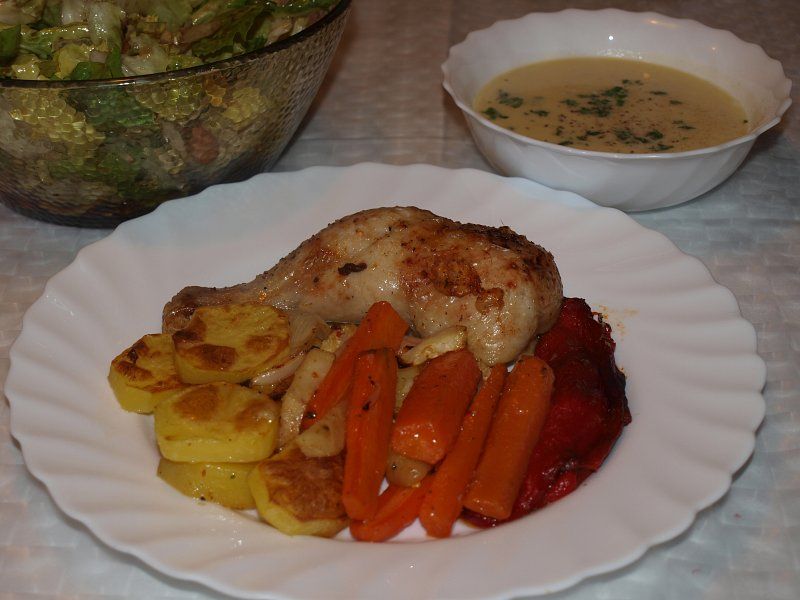 Bučno-korenčkova juhica; nadevano piščančje bedro, pečen krompir s korenčkom