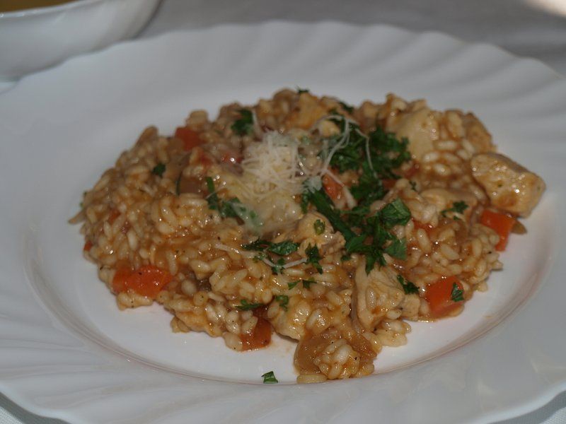 Kremna cvetačna juhica; rižoto s piščančjim mesom
