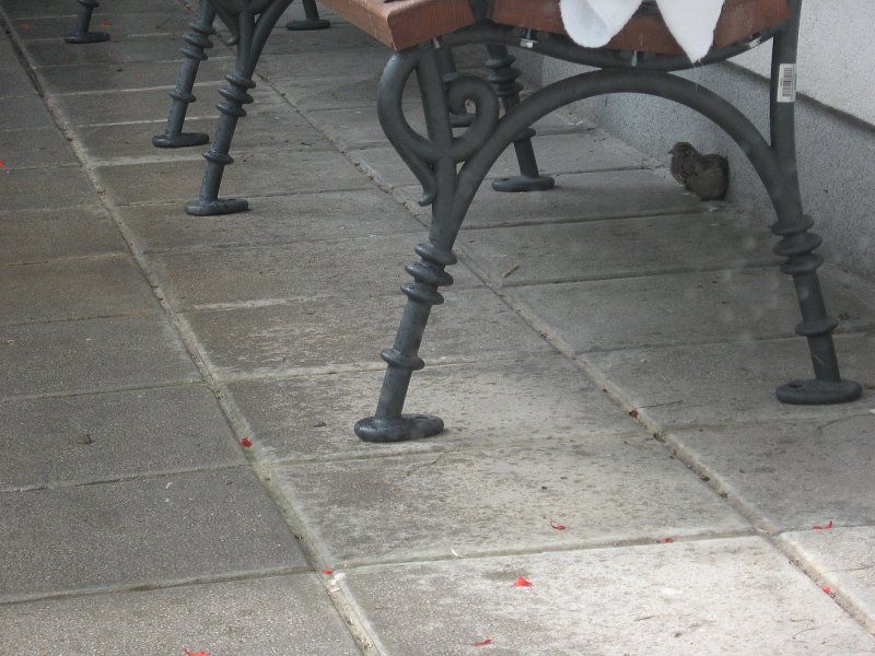 v hudi nevihti sta vrabčka vedrila v malem atriju pod klopjo.
