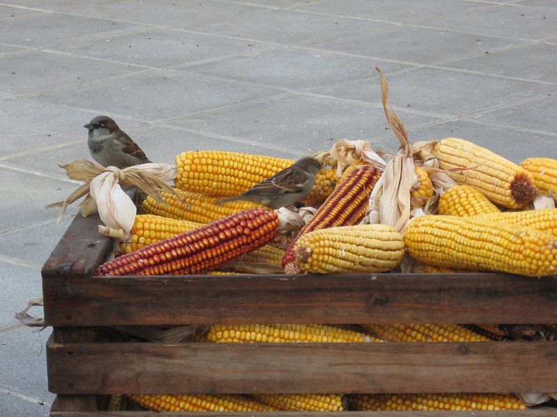 Skoraj ni za verjet, da "naši" vrabčki jedo tudi koruzo, najbrž manjša zrna