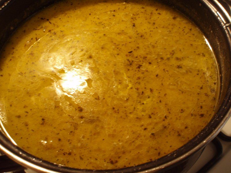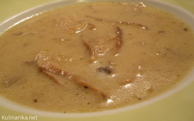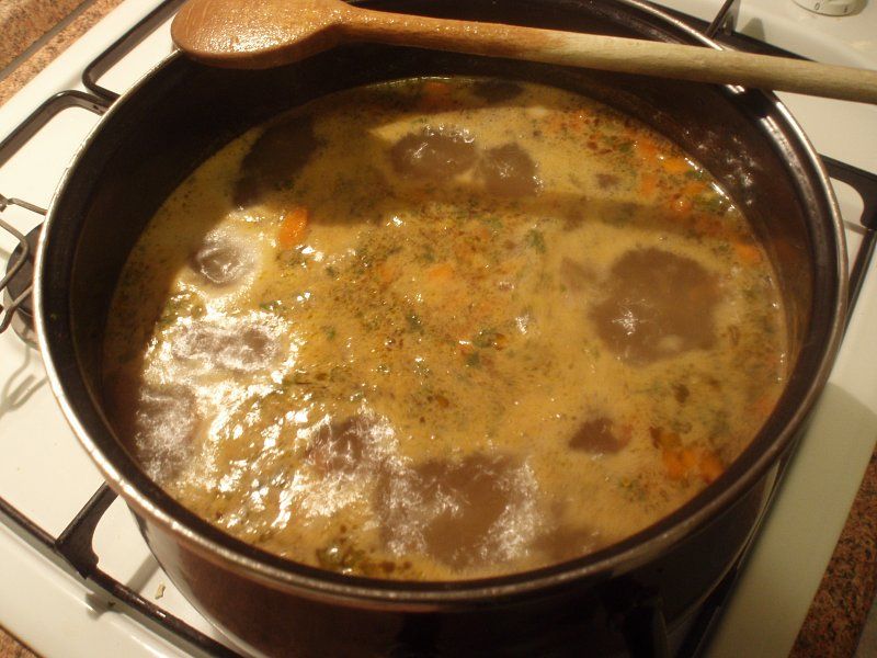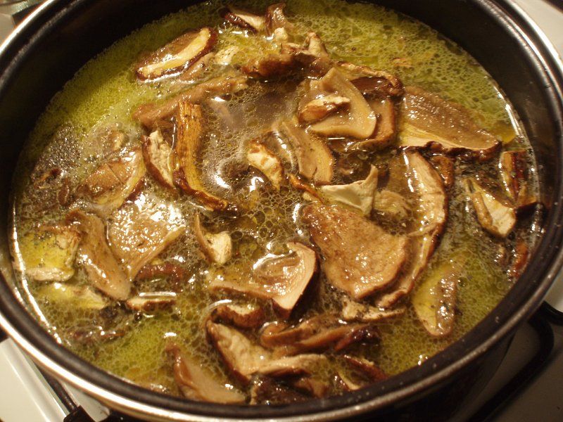 Začinimo,dodamo vročo vodo in odcejene gobe