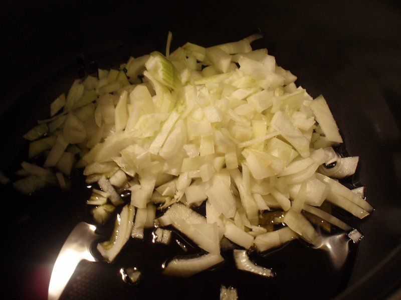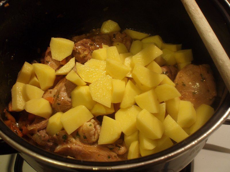 K čebuli pridenemo nakockan krompir. Še malo dušimo