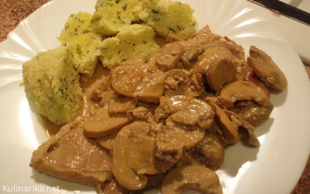 Telečji zrezki v gobovi omaki z blitvini žličniki