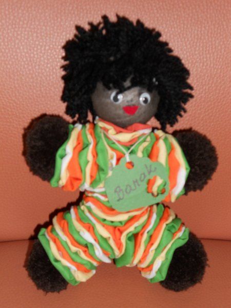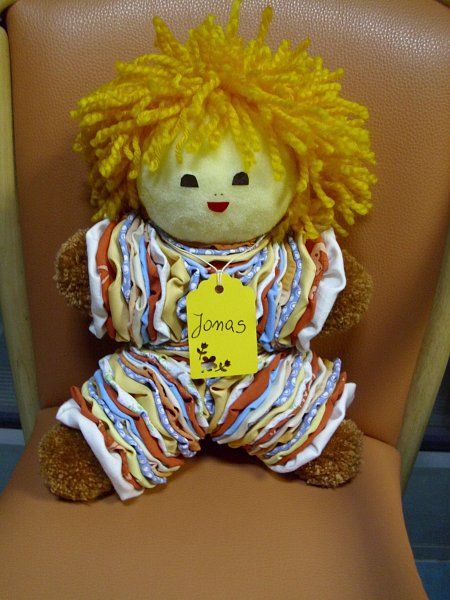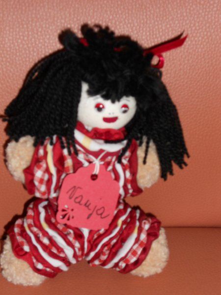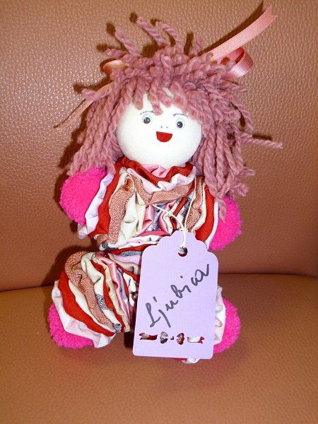 Če živite v bližini, vas vabim, da nas obiščete, pa boste v živo videli. Sicer pa: glava penasta guma ali stiroporne kroglice, laski in cofki volna, ostalo ostanki blaga, učki in usta pri večjih iz usnja, učki pri malih pa