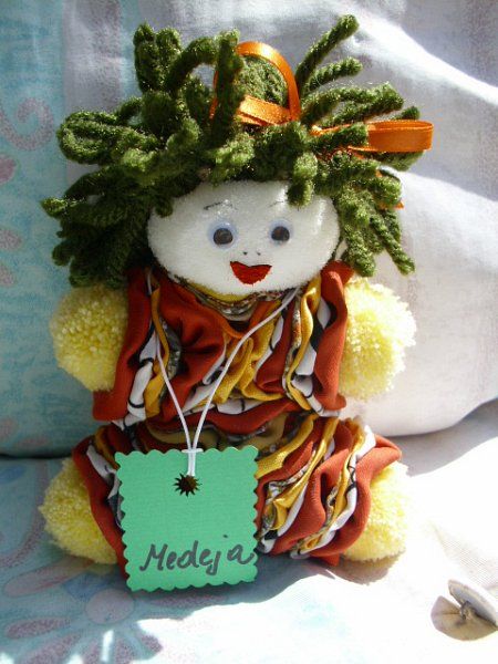 Če živite v bližini, vas vabim, da nas obiščete, pa boste v živo videli. Sicer pa: glava penasta guma ali stiroporne kroglice, laski in cofki volna, ostalo ostanki blaga, učki in usta pri večjih iz usnja, učki pri malih pa