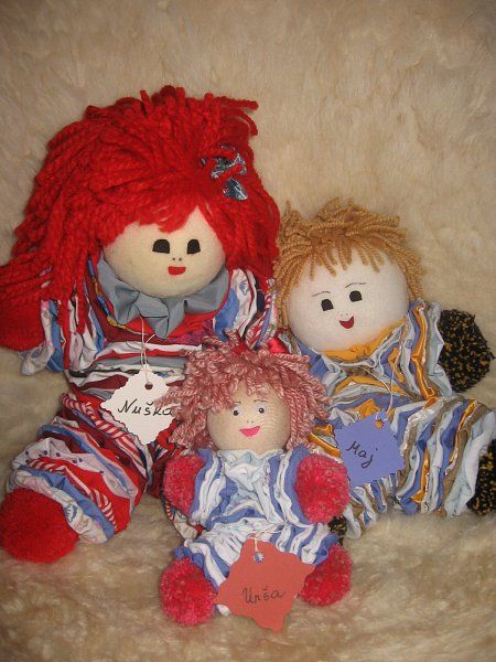 Če živite v bližini, vas vabim, da nas obiščete, pa boste v živo videli. Sicer pa: glava penasta guma ali stiroporne kroglice, laski in cofki volna, ostalo ostanki blaga, učki in usta pri večjih iz usnja, učki pri malih pa