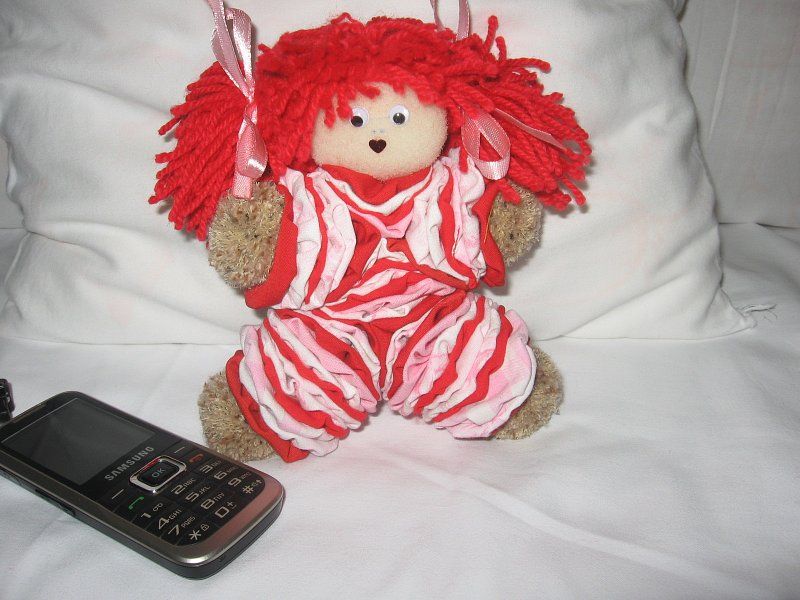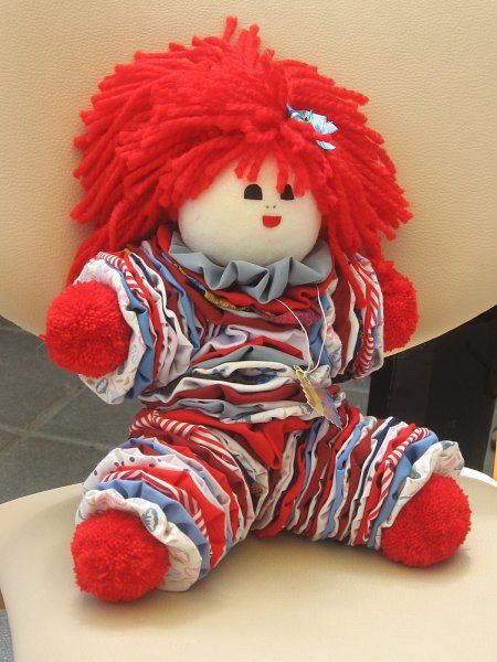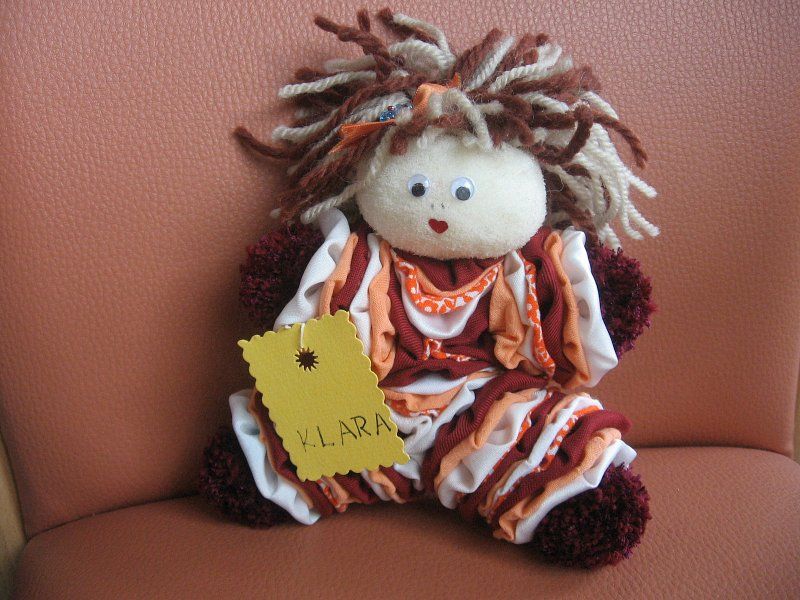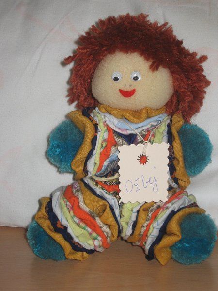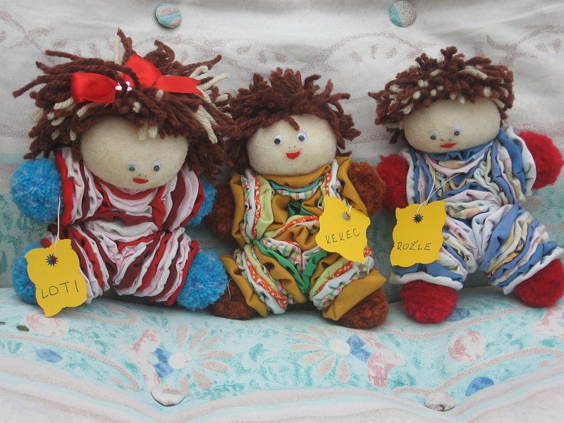 Če živite v bližini, vas vabim, da nas obiščete, pa boste v živo videli. Sicer pa: glava penasta guma ali stiroporne kroglice, laski in cofki volna, ostalo ostanki blaga, učki in usta pri večjih iz usnja, učki pri malih pa