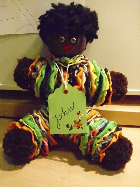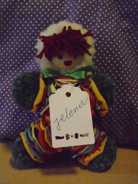 Če živite v bližini, vas vabim, da nas obiščete, pa boste v živo videli. Sicer pa: glava penasta guma ali stiroporne kroglice, laski in cofki volna, ostalo ostanki blaga, učki in usta pri večjih iz usnja, učki pri malih pa