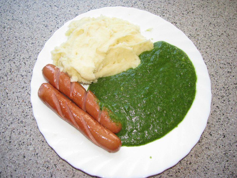 pire krompir,kremna špinača,pečena hrenovka