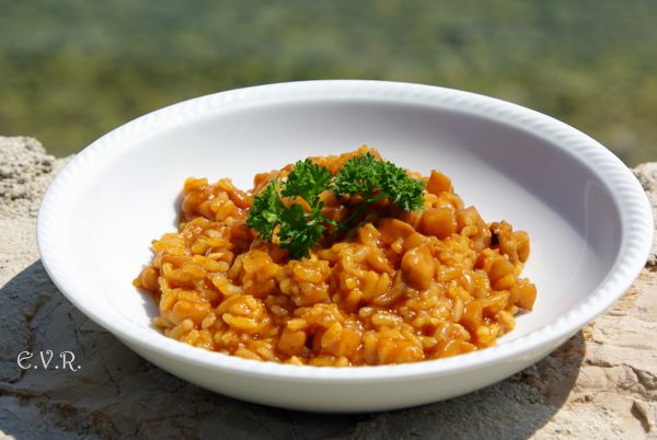 Casarecce iz čičerike z bučo, porom, brokolijem, šetrajem, parmezanom in olivami