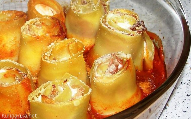 zvitki iz lazanje s Philadelphia sirom in pršutom v paradižnikovi omaki