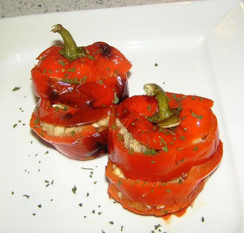 motovilec s sezamovo mocarelo in nadevanimi češnjevci v pečenem jajčevcu
