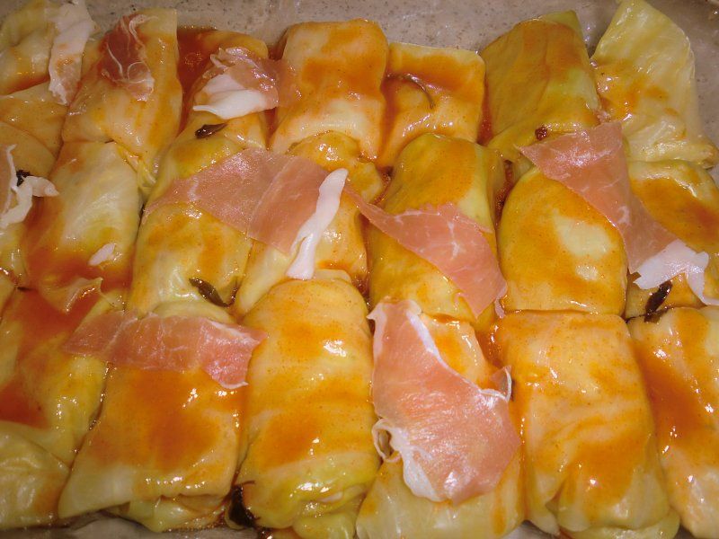 v pekaču prelijemo s paradižnikovo omako, po želji slanina, pršut...