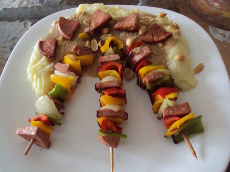 Ražnjiči s pire krompirjem in arašidovo omako