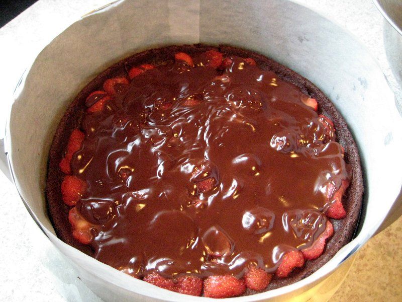 domov » foto albumi » album: Majska torta » Čokoladni preliv na jagodah, več preliva na sredini torte.