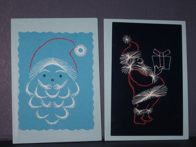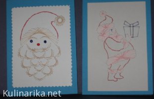 Renata, čisto enostavno. Slikico s pomočjo šivanke ali kakega drugega ostrega koničastega predmeta napikam na kartonček, potem pa s svilo, sukancem ali prejico našijem v željenih barvah.