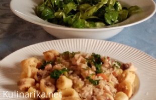 domov » foto albumi » album: Kosila v letu 2021 » Pražen krompir, panirani pišč. zrezki, hrenovo-kumarična omaka; zelena solata