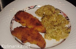 Prepražila sem čebulo, dodala narezano papriko, narezano bučko, narezan paradižnik - kratko prepražila in dodala... - V ponedeljek je bila rižota, tako da je danes odpadlo. Glej ga zlomka, imam proseno kašo. - ... eno pest prosene kaše, podlivala, dodala ščepec peteršilja in česen, povegetala, solila in nastala je dobra priloga k paniranemu meseku.