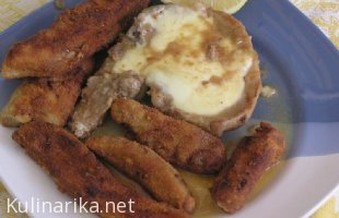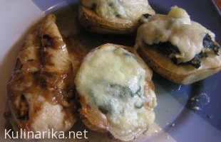 Recept je sicer (približno) iz Goljatove knjige Krompir. Sicer pa "štefka", zavita v liste blitve (po receptu v ohrovt), pa v čisto navadno krompirjevo testo za cmoke, v katerega sem pa tokrat žal dala malo premalo moke in se je razlezlo, tako da zgledalo ni točno tako kot bi moralo, ampak dobro je bilo pa vseeno.