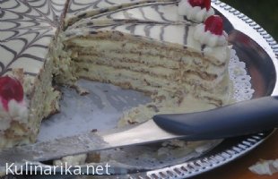 Torta ima glazuro iz bele čokolade. Na to glazuro narediš kroge iz temne čokolade, potem pa samo še preden se čokolada strdi potegneš iz sredine navzven z zobotrebcem, pa se ti naredi taka mreža. Upam, da je razumljivo.