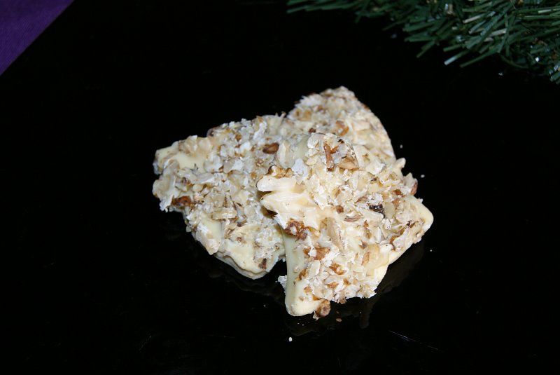 To so keksi pomočeni v belo čokolado in nalistane orehe.