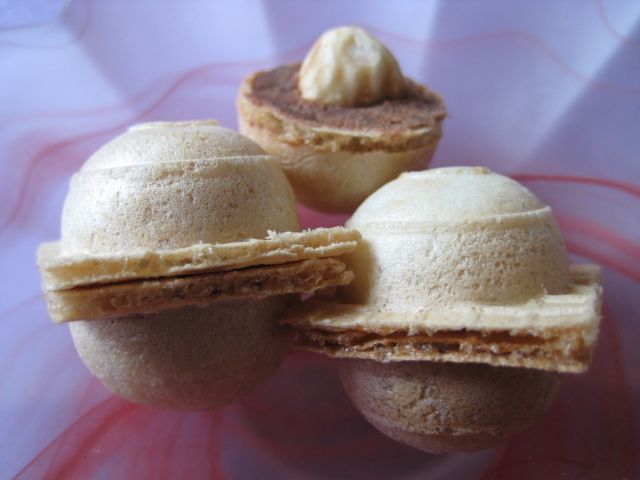 Za čokoladno kremo skuham 3 dl sladke smetane, 200 g jedilne čokolade in 2 žlici Nutelle (ne kakšnega nadomestka). Kremo dam čez noč v hladilnik, da se strdi. Naslednji dan zmešam kremo z mešalnikom, nabrizgam kremo v vdolbinice, na sredino pa dam prepražen lešnik. Razrežem jih naslednji dan, ko se krema strdi, oblati pa ostanejo hrustljavi.