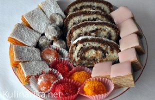 Biskvit: 6 jajc, 5 žlic sladkorja, pribl. 80 g čokolade v prahu in 20 g kakava, noževa konica pecilnega praška.