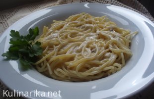 Široki rezanci s kuhanim pršutom, mlado špinačo in porovo kremo