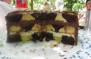 Žal, recepta ni!. Sem pred dnevi dobila modelček od Neckermana, pa sem morala poizkusiti (smo imeli ravno en piknik). Naredila sem testo za marmorni kolač, plošče pa sem premazala z belo in rjavo pariško kremo. Za prvo peko v tem modelču sem bila kar zadovoljna, čeprav mislim, da bi morala narediti malo bolj trdo testo, da bi se "šahovnica" lepše videla.