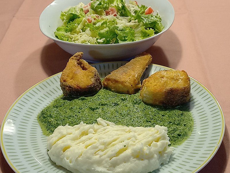 domov » foto albumi » album: Kosila v letu 2022 » Pečen oslič, pire krompir, špinača; mešana solata