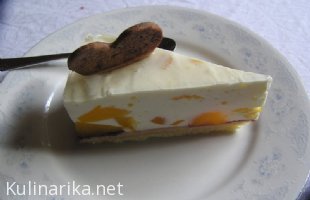 Mogoče še najbolj podobna junijski torti. Spodaj piškotno testo, krema pa iz smetane, jogurta, želatine in koščkov sadja. Samo piškotov nima po obodu. Bom poslala še slikco koščka torte. Tole sem delala za naju z možem za trinajsto obletnico poroke, ki sva jo praznovala včeraj (na 15 let podlage). Danes sem pa naredila še podobno, samo okroglo, pa namesto breskev sem dala jagode za taščo za rojstni dan. Tokrat brez slikce.