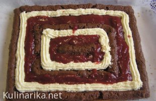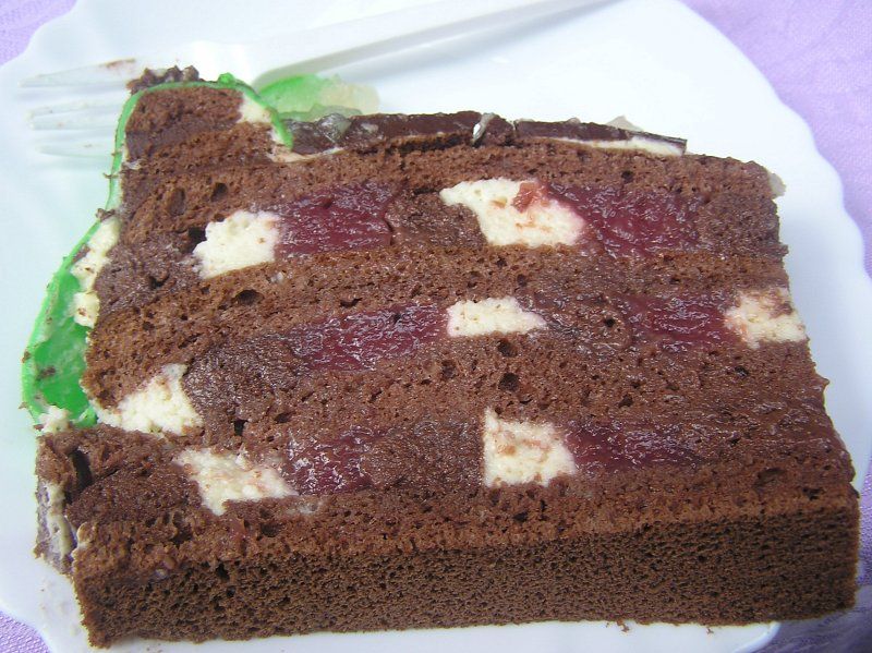 Zadnje tri slike so od ene torte. Na prejšni sliki vidiš, kako sem kremo dala na plast biskvita, tole tu je košček torte (tri kreme, čokoladna, smetanova, višnjeva). Na trenutno zadnji sliki v albumu pa cela Smetanova torta s čokolado in višnjami.