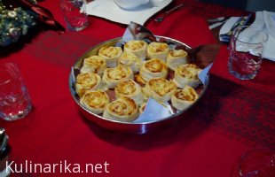 Vzames listnato testo (jaz ga kupim pri Lidlu) ga na tanko namazes s paradiznikovim pirejem, posipas z na kocke zrezano sunko, naribanim sirom in sesekljanim petersiljem (lahko je tudi posusen), rolado zarolas in narezes na 2 - 3 cm koscke in peces na 170 stopinj 12 - 15 minut, zavisi, kaksno pecico imas. Lahko pa nadev poljubno spreminjas, vse, kar ti domisljija dopusca ...