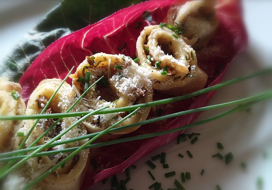 Tortelini z bučkami in slanino