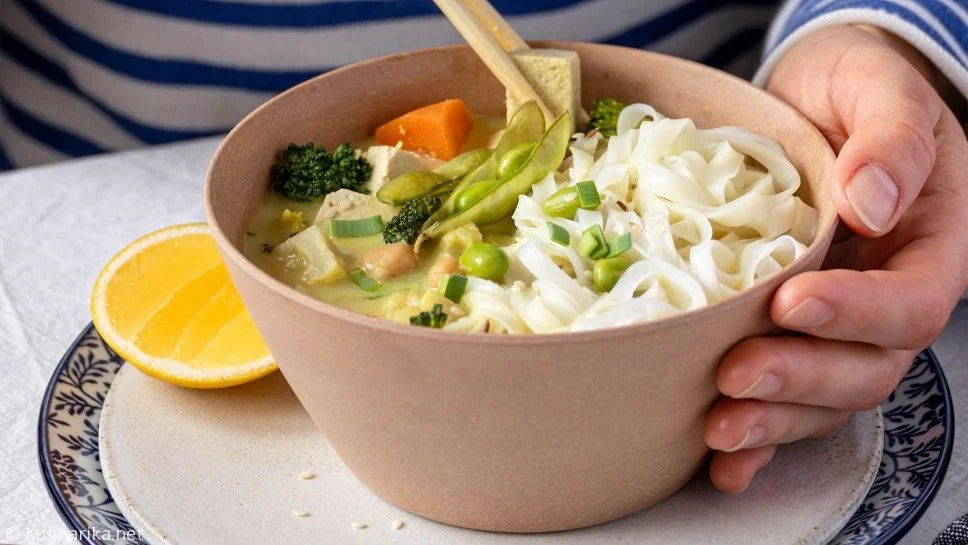 Na koncu dodamo še čičeriko, tofu in edamam. Solimo, dodamo kokosovo mleko in toliko vode, da dobimo konsistenco juhe. Premešamo in pustimo, da zavre. Medtem skuhamo riževe rezance (navadno se jih kuha 3 minute).
