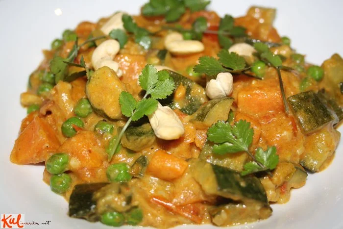 veganski curry z veliko zelenjave in kremo iz indijskih oreščkov in kokosovega mleka