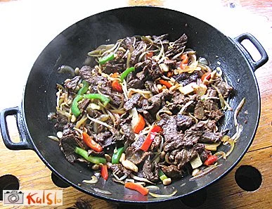 Po potrebi dodamo še malo olja in ko je vroče, stresemo v vok čebulo. Premešamo, dodamo česen in meso. Ponovno premešamo in dodamo še narezano papriko. Pražimo dve do tri minute, potem zalijemo z ostrigino omako, ki smo jo, skupaj s sojino omako, razmešali z riževo moko in mlačno vodo. Ko prevre, še malo premešamo, dodamo še sojine ali ostrigine omake, pač po okusu. Vok odstranimo z ognja in jed prelijemo z žlico ali dvema sezamovega olja.