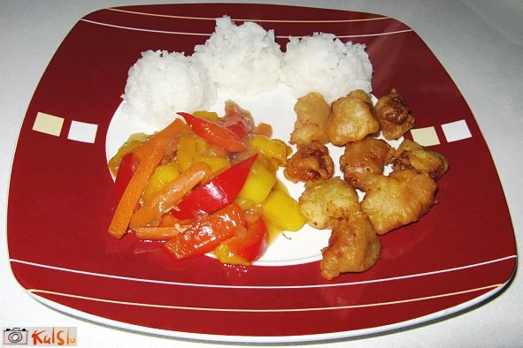 Omaka: Skupaj zdušimo eno čebulo in tri na pramene narezane korenčke, dodamo svežo papriko in vse skupaj zalijemo s 3 dcl vode oz. juhe v kateri smo razstopili eno žlico medu. Počasi naj vre dobrih 10 min. Dodamo 1/2 žličke ingverja, cayenski ali navaden poper, pribl. 1 dcl sojine omake. Po okusu lahko dodate tudi nekaj ananasa. Na koncu vse skupaj zgostite s škrobno moko. Pribl. 1 1/2 žlicke škrobne moke in 2 žlici hladne vode zmešajte skupaj v lončku in vse skupaj zlijete v rahlo vrelo omako, premešate in pustite še 2 minuti in omaka je končana. Skuhate jasminov ali kateri drugi riž. Jaz ga kuham z govejo kocko, maslom in poprom. Kitajci kuhajo riž brez vsega.