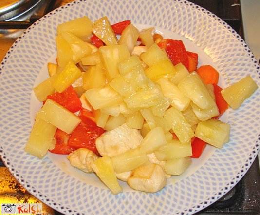 5Prsa narežemo na kockice, posolimo in popečemo. Dodamo še narezano papriko in korenje (narežemo na večje koščke - glej sliko, in na koncu mora še vedno biti trdo, kot bi bilo sveže). Vse skupaj pečemo, dokler meso ni pečeno. Preložimo na krožnik, v posodo od mesa (najbolje kakšen vok) pa vlijemo ananasov sok in dodamo mešanico iz vrečke. Kuhamo par minut. Nato damo nazaj v vok meso, papriko, korenje in ananas. Kuhamo še 5 minut.