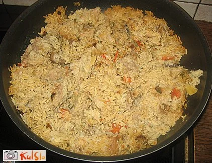 Posodo, v kateri bomo jed končali - pekač ali drugo ognjevarno posodo - namažemo z oljem, damo vanjo marinirano meso in potem še riž ter vse skupaj dobro premešamo. Po vrhu poškropimo z oljem, posodo tesno pokrijemo z alu folijo in v pečici pečemo uro in pol na 170 stopinjah.