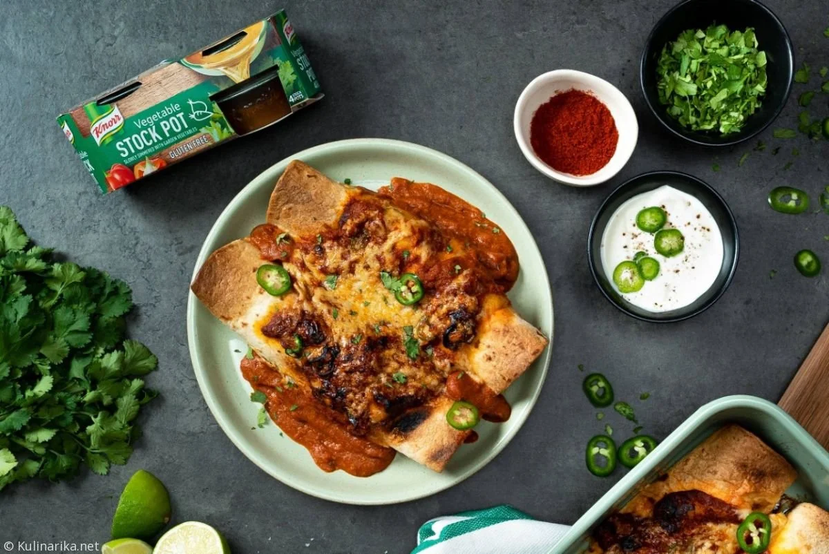 8. S paličnim mešalinkom na fino spasirajte omako, ki ste jo dali prej hladit v posebno posodo. Omako polijte po sredini zloženih tortilij tako, da konci ostanejo na suhem.