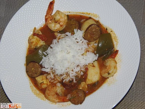 V jambalaji so obvezno škampi. Če jih ne najdete, bo kakršnakoli kombinacija rib in školjk več kot dobra. Če imate radi pekoče jedi, lahko dodate par majhnih hudih peperončkov. Riž lahko skuhate tudi v paradižnikovi omaki, mi pa ga imamo raje kot prilogo.