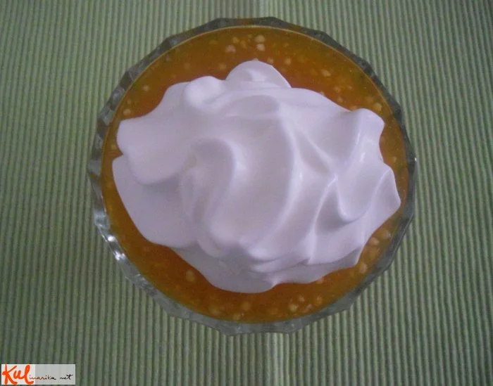 Prelijemo v kozarčke, počakamo, da se ohladi in damo na vrh žlico na pol stepene sladke smetane s sladkorjem.
