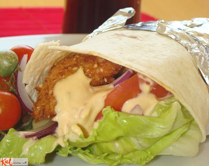 Sestavine za omako pomešamo in damo v hladilnik za čas priprave mesa. Solato natrgamo na večje kose, ostalo zelenjavo pa narežemo na kolobarje. Piščančje meso narežemo na trakce in ga prelijemo z gosto tekočo tempuro mešanico in vse dobro premešamo. Tempuro mešanico pripravimo po navodilih proizvajalca. Azijskim drobtinam dodamo sezamova semena in premešamo. Meso povaljamo v drobtinah in ga zlato rjavo ocvremo v olju. Tortiljo pogrejemo, vanjo nato dodamo meso, prelijemo z omako in dodamo narezano zelenjavo. Na koncu dodamo natrgano solato in jo zavijemo v tortiljo. Postrežemo z mrzlo pijačo.