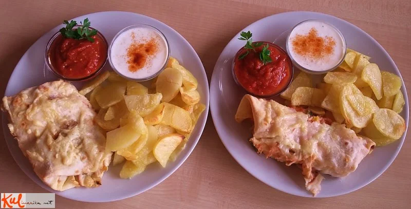 To je za dve osebi verjetno(za malico ali kosilo?).Je zelo mamljivo,bi kar danes probala,smo pa štirje.Tortilje zavijemo kot palačinke ali samo na polovico?