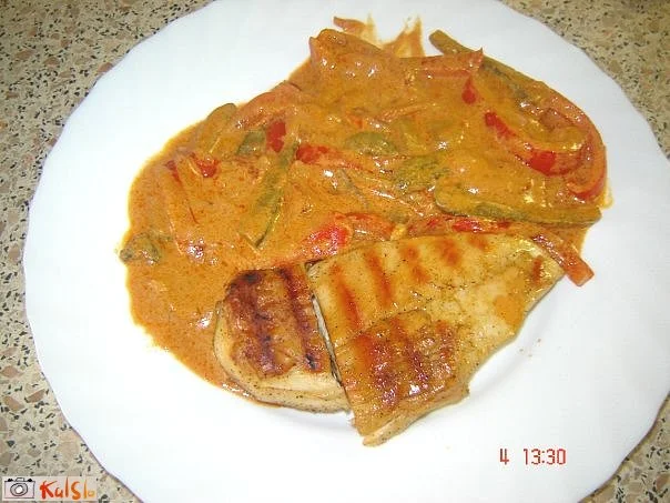 V drugi posodi posteklenimo na olju nasekljano čebulo, pritresemo na lističe narezano papriko, šampinjone, še malo skupaj podušimo, dodamo na lističe narezan česen, poprašimo z moko, dodamo gorčico, Worchester omako, sojino omako, sladko papriko, na drobno sesekljan in od semen očiščen feferon ter zalijemo s približno 1 dl juhe.