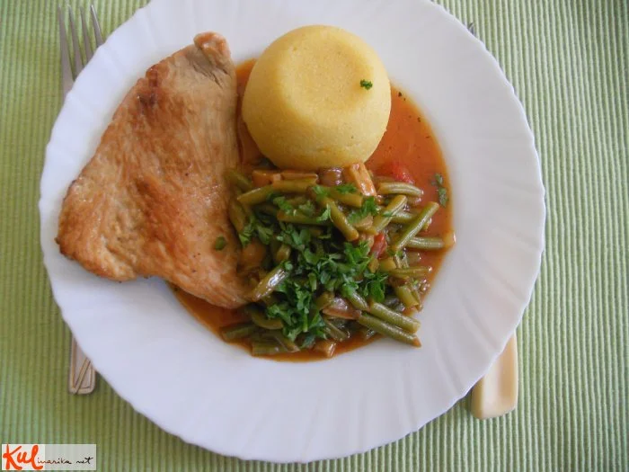 Po 10 minutah dodamo olupljen, nakockan zrel paradižnik in stročji fižol.